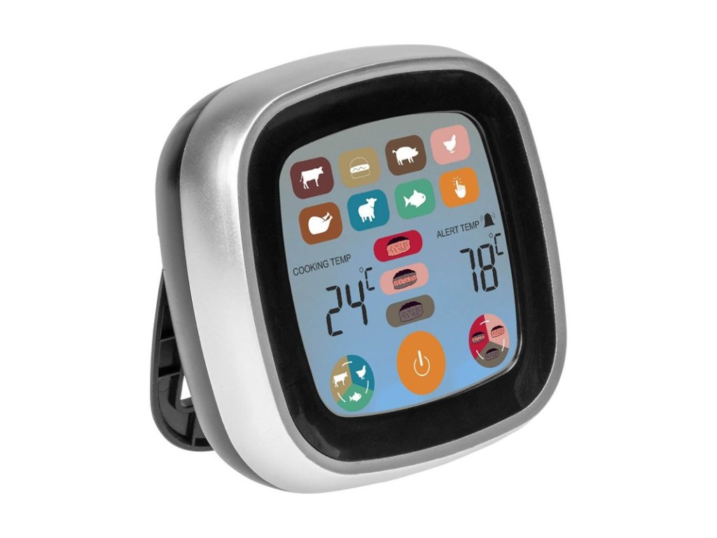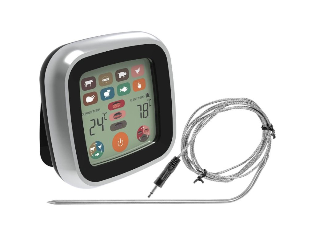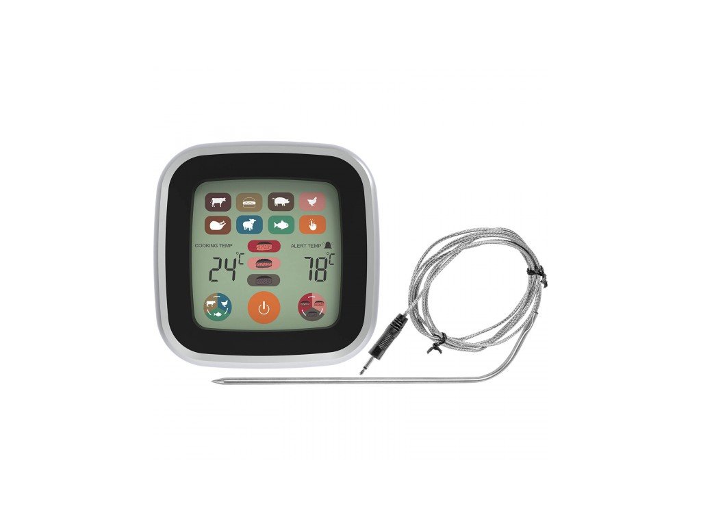Elektronický kolíkový teploměr s dotykovým LCD displejem. Ideální do každé kuchyně a gastronomie. Ideální pro přesné měření teploty vařeného a pečeného masa a ryb (funkce 7 druhů pokrmů a 3 úrovně propečení).