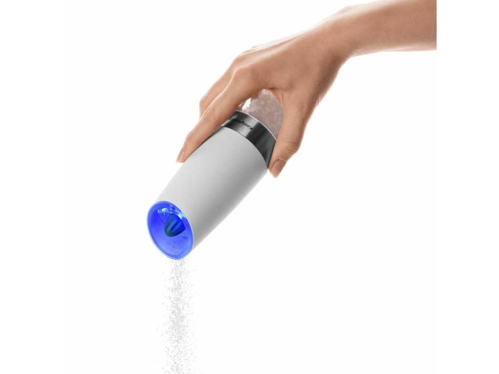 Přesné kořenění a snadná údržba Mlýnek umožňuje přesné nastavení jemnosti mletí koření podle vašich potřeb. Množství mleté soli a pepře můžete snadno kontrolovat díky podsvícení zabudovanému v produktu. Tento elektrický mlýnek lze snadno ovládat jednou rukou, což vám umožní druhou rukou míchat těstoviny nebo omáčku.