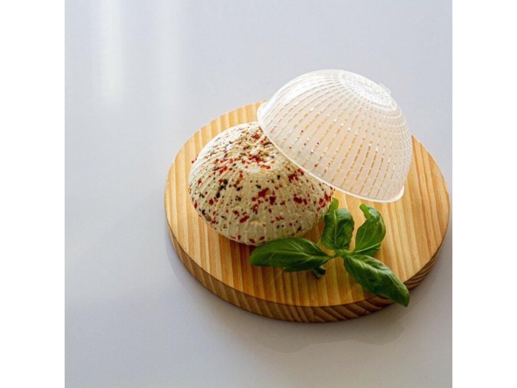 Forma na výrobu sýra pro domácí výrobu sýrů, kulatá, ideální zejména na měkké syřidlo a tvaroh. Umožňuje získat sýr ve tvaru polokoule. Forma má otvory, kterými odtéká syrovátka a nožičky, díky kterým se odkapávající tekutina nedostane do kontaktu se sýrem.