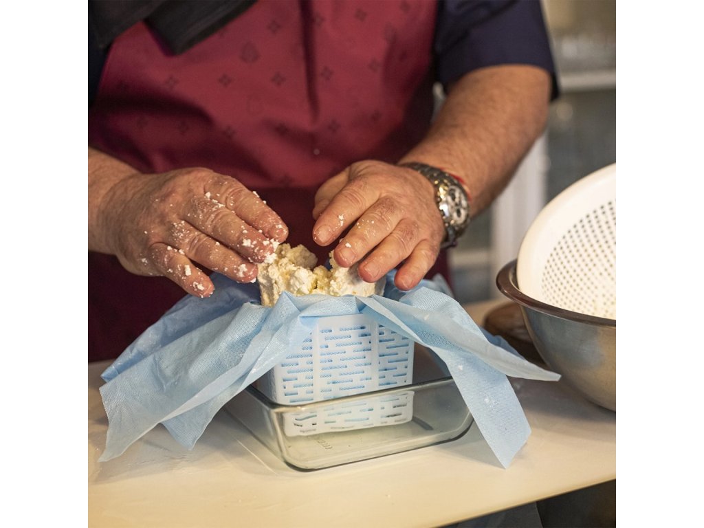 Pohodlné použití - forma má otvory, kterými odtéká syrovátka, a nožky, které zabraňují tomu, aby se kapající tekutina dotkla sýra. Forma může být také použita s dřevěným lisem na sýr nebo použitím identické druhé formy jako víka.