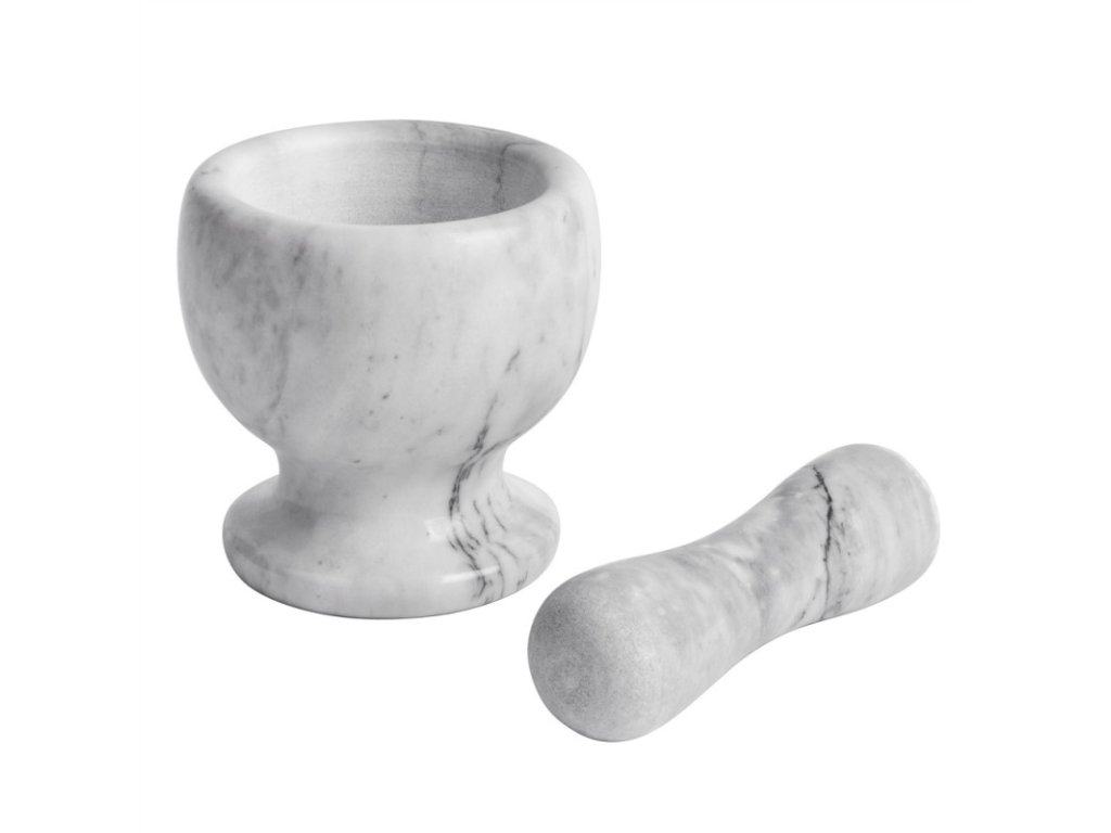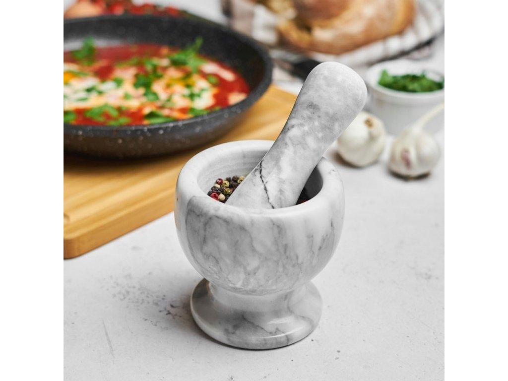 Mramorový kuchyňský hmoždíř je praktický a elegantní nástroj pro přípravu správně namletých a aromatických směsí bylinek a koření. Tento kvalitní hmoždíř je vyroben z krásného šedého mramoru s jedinečnou texturou, který dodá vaší kuchyni stylový vzhled. Přírodní materiál zaručuje dlouhou životnost a otěruvzdornost. Hrubý vnitřek hmoždíře a hrot paličky umožňují rychlé a efektivní mletí surovin.