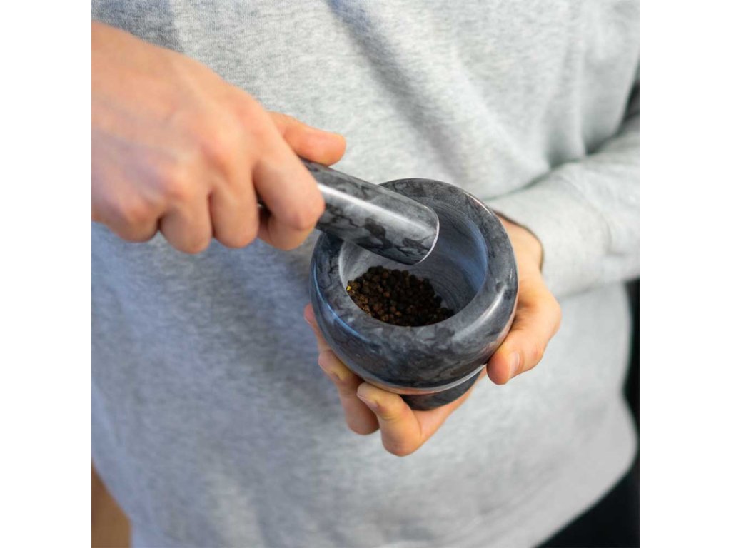 Přírodní, ušlechtilý materiál - hmoždíř a palička jsou vyrobeny z mramoru, což je odolný a otěruvzdorný materiál. Černá, stínovaná barva a žilkovaná textura činí každý kus jedinečným.