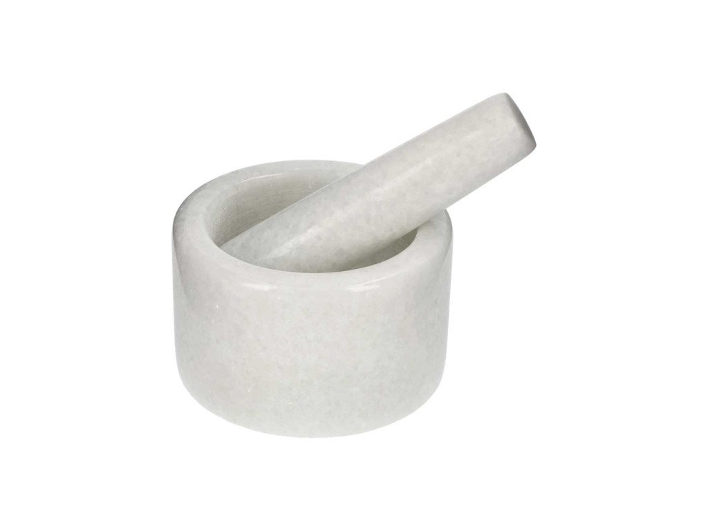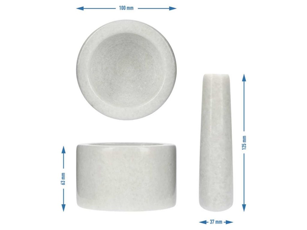 Hmoždíř a palička jsou vyrobeny z mramoru - elegantního, trvanlivého a otěruvzdorného materiálu. Bílá barva a charakteristická textura tohoto kamene činí každý kus jedinečným.