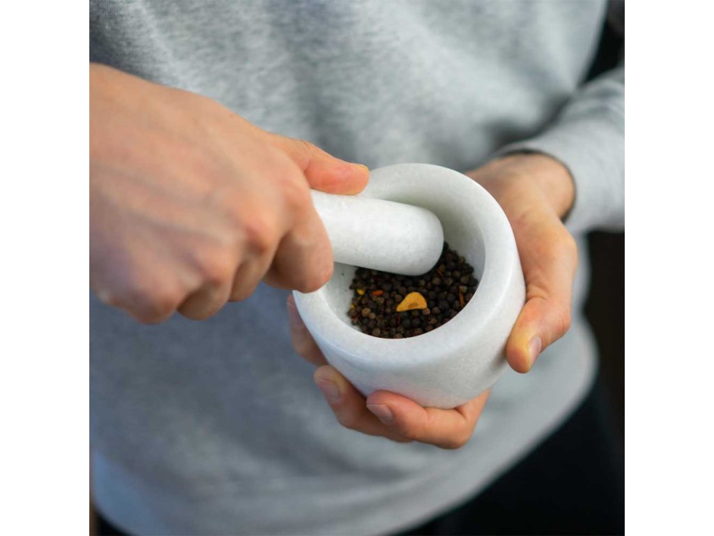 Sníte o vlastních aromatických směsích bylinek a koření? Tento elegantní mramorový hmoždíř vám s tím pomůže. Je vyroben z ušlechtilého a odolného kamene - bílého, krystalického mramoru s jedinečnou texturou. Hrubý vnitřek hmoždíře a hrot paličky a vhodná hloubka z něj činí ideální nástroj pro drcení bylinek a koření, ale i ořechů a léků. Bude vám úspěšně sloužit mnoho let.