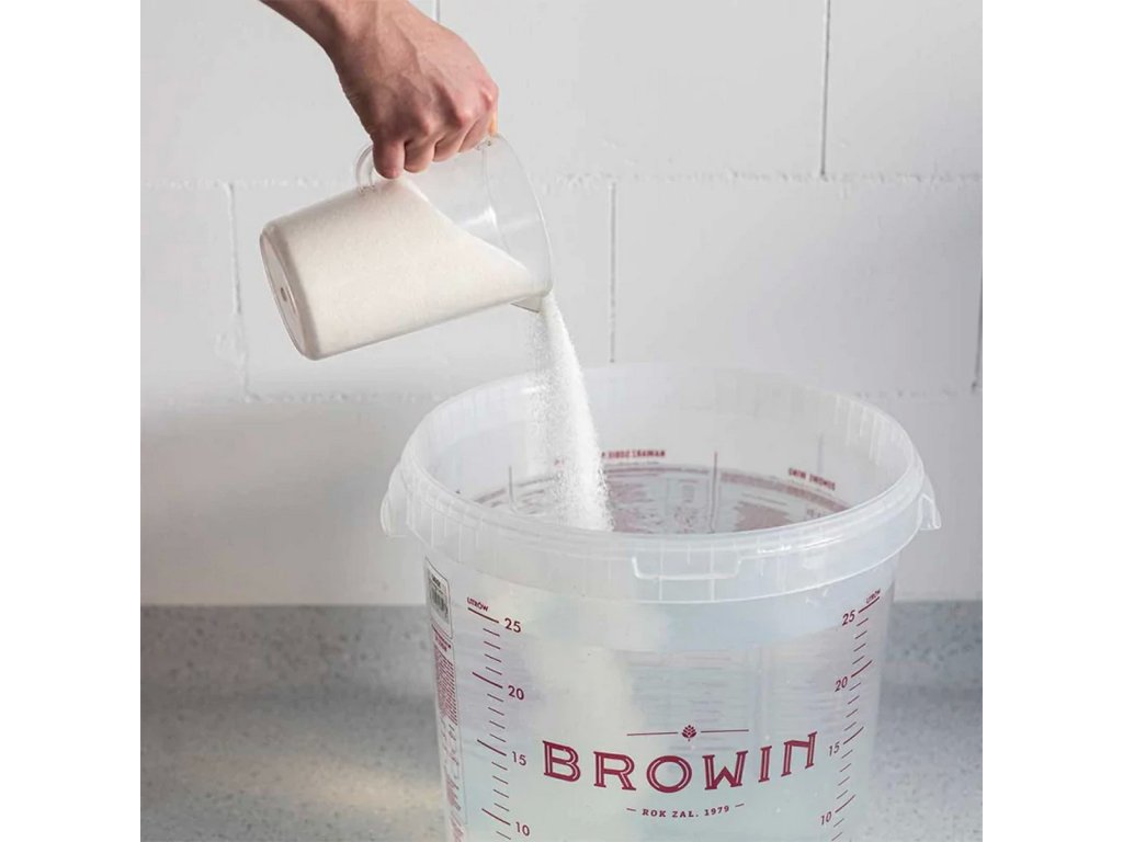 - Po vychladnutí na 30°C přelijte tekutinu do balónku nebo fermentační nádoby a doplňte vodou pokojové teploty na 25 litrů.