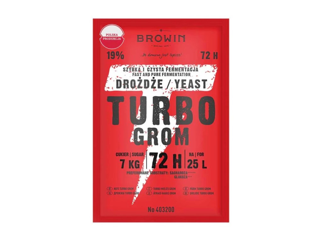 Turbo Grom 72h lihovarnické kvasnice jsou ideální směsí kvasnic, živin a vitamínů pro rychlé a čisté kvašení. Umožňují získat až 19% alkoholu za 7-10 dní! Doporučují se zejména pro nastavení cukru. Jedno 120g balení vystačí na 25l dávku s použitím 6-8 kg cukru. Výrobek se velmi snadno používá. Poznámka: Pro jedno nastavení použijte celé balení.