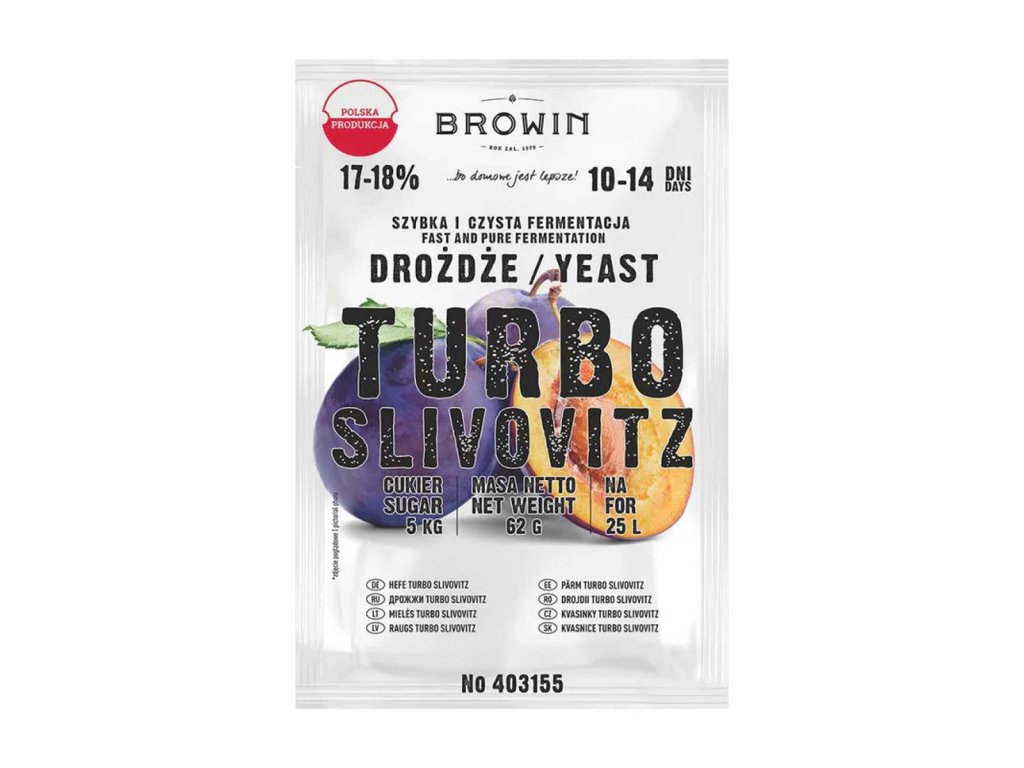 Slivovice, také známá jako Slivovitz, je vysoce odolný, suchý alkoholický nápoj vyrobený kvašením speciálně vybraných maďarských švestek. Destilační kvas Turbo Slivovice byl vytvořen pro zajištění rychlého kvašení ovocných přípravků. Speciálně vybraná směs kvasnic, živin, vitamínů a pektoenzymu je ideální pro kvašení švestkových směsí. Kvasnice umožňují získat až 17-18% alkoholu za 10-14 dní a dodávají směsi charakteristickou chuť domácí slivovice. Jedno 62g balení vystačí na přípravu až 25 l s použitím pouhých 5 kg cukru. Jejich použití je extrémně jednoduché a efekt předčí vaše očekávání!