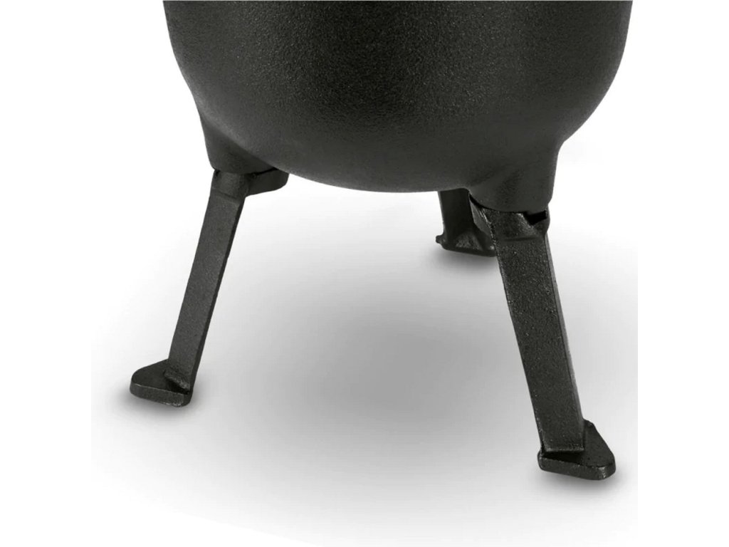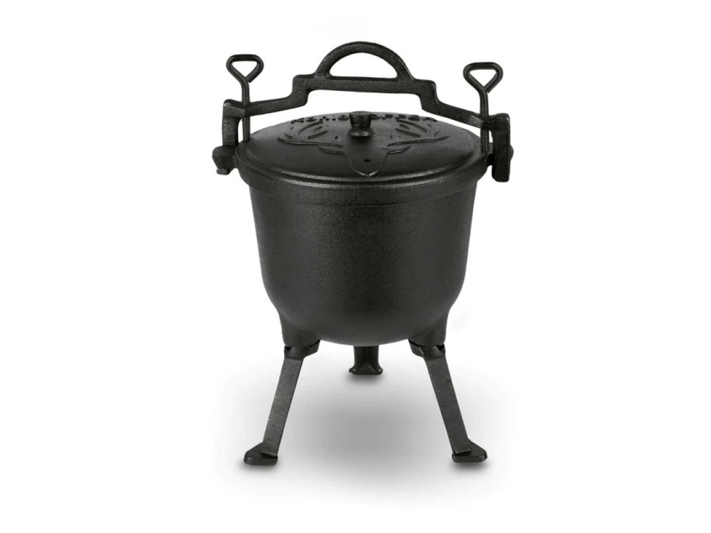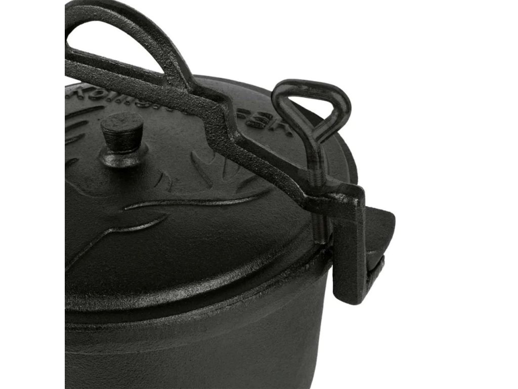 Těsně přiléhající víko s kovovým držadlem umožňuje zavěšení nad oheň. Ventilační otvor pomáhá regulovat tlak při vaření a tři odnímatelné nožky usnadňují transport.
