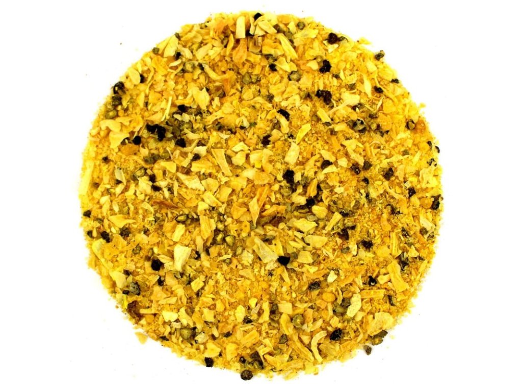 Složení: sůl, černý pepř, česnek, cibule, citronová kůra (14%), cukr, kurkuma, regulátor kyselosti: kyselina citronová.