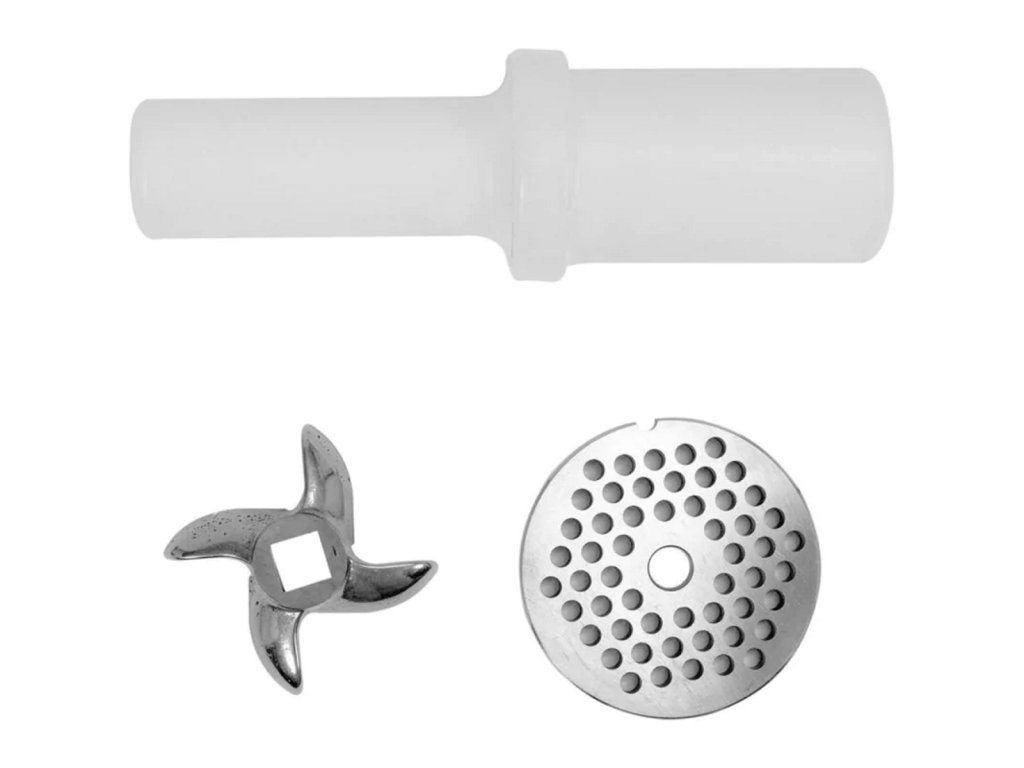 Mlýnek je vybaven protiskluzovými nožkami pro bezpečný provoz a resetovacím tlačítkem pro ochranu motoru. V balení najdete také přítlačný kolík z polyetylenu, který usnadní manipulaci s masem během mletí. Všechny komponenty byly navrženy pro snadné rozebrání a čištění.