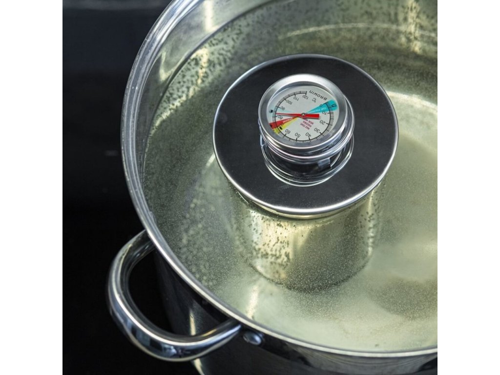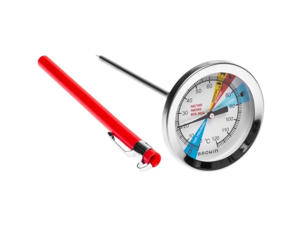 Teploměr se sondou zajišťuje plnou kontrolu teploty během spařování. Sonda teploměru se zasouvá přímo do šunkovaru - přes speciální zásuvku ve víku.