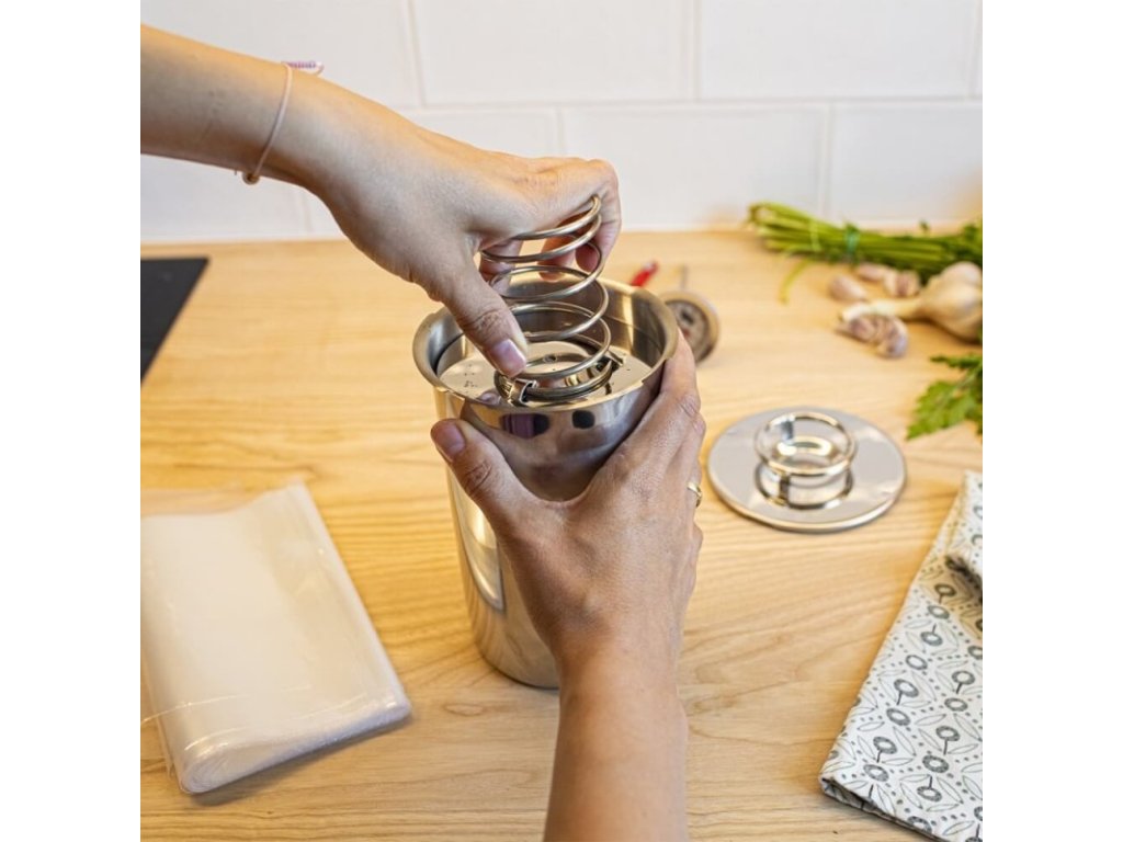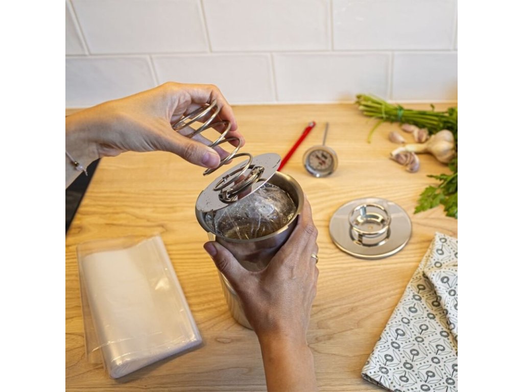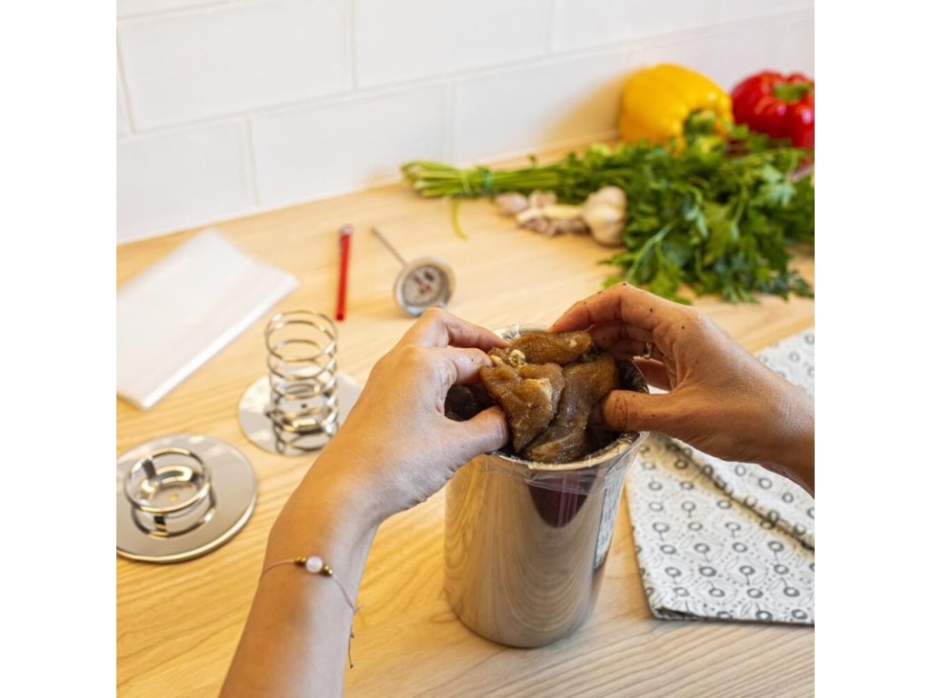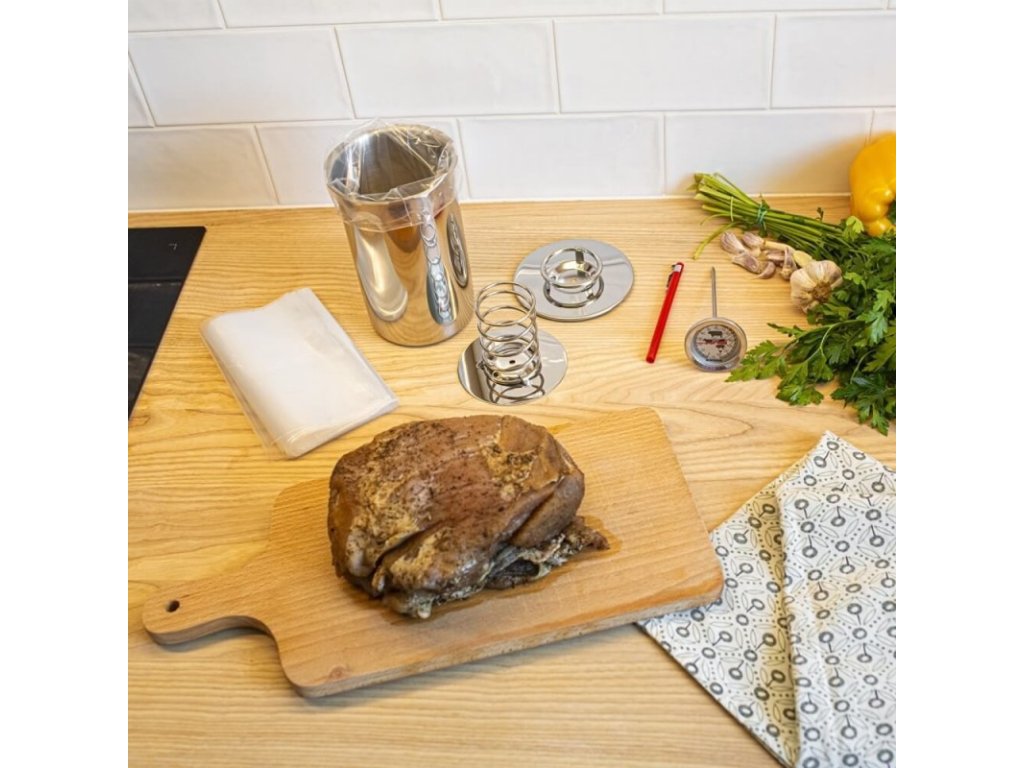 Výrobce představuje sadu ideální pro přípravu masa - šunkovar s teploměrem a sáčky. Je určen k přípravě lahodných, opařených mas domácím způsobem. Snadno se používá a umožňuje přípravu masného nebo vegetariánského produktu.