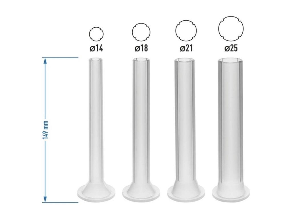 Sada obsahuje 4 plastové násady v různých velikostech - průměry: 14, 18, 21 a 25 mm.