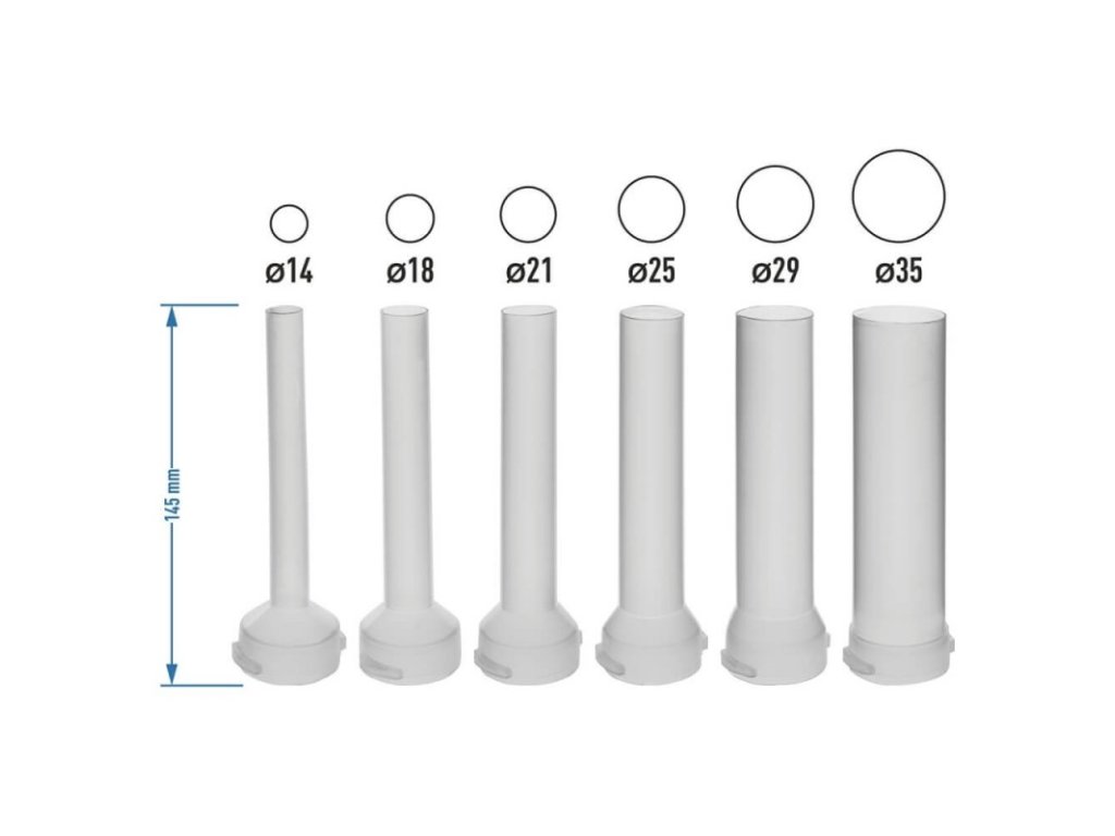 6 trychtýřů s různými průměry: 14, 18, 21, 25, 29, 35 mm
