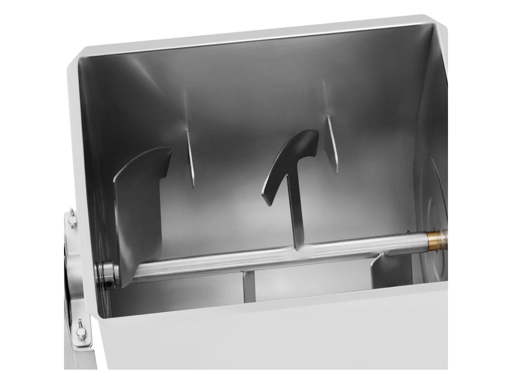 Nerezová nádoba poskytuje dostatečnou kapacitu pro velké množství surovin, zaručuje hygienu a snadné čištění. Ruční klikový pohon spolu s čtyřmi hliníkovými lopatkami umožňuje rychlé a rovnoměrné promíchání ingrediencí, takže směs je připravena k plnění do střev nebo dalšímu zpracování.