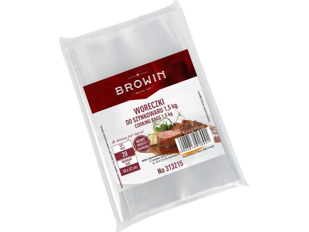 Sada 20 pevných, potravinově bezpečných sáčků z průhledné fólie. Sáčky o rozměrech 16 cm x 32 cm se perfektně hodí do nerezového šunkovaru s kapacitou 1,5 kg. Díky nim můžete nejen jednoduchým a rychlým způsobem vložit a vyndat várku z komory šunkovaru, ale také udržovat zařízení bezvadně čisté.