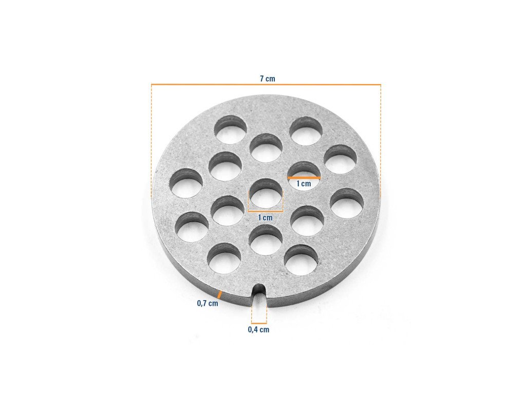 Oferované sitko má číslo 10. Průměr sítka je 70 mm, průměr oka v sítku je 10 mm a průměr centrálního otvoru je také 10 mm. Správná velikost sítka ovlivňuje účinnost mlýnku na maso.