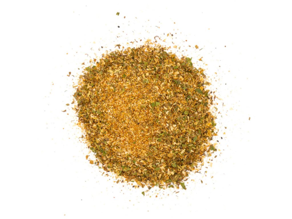 Sůl, česnek, koriandr, sušená cibule, sladká paprika, muškátový oříšek, kmín, majoránka, petrželová nať, tymián, sušený kopr, černý pepř, rozmarýn, chilli.
