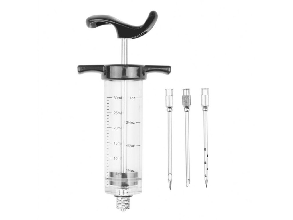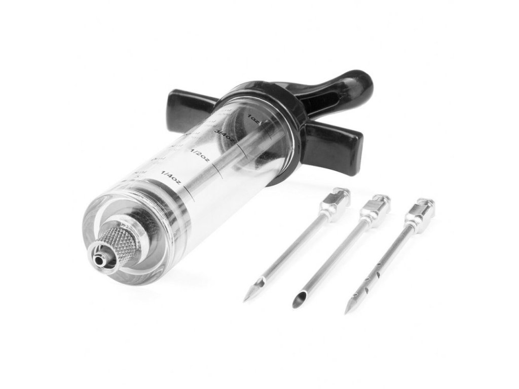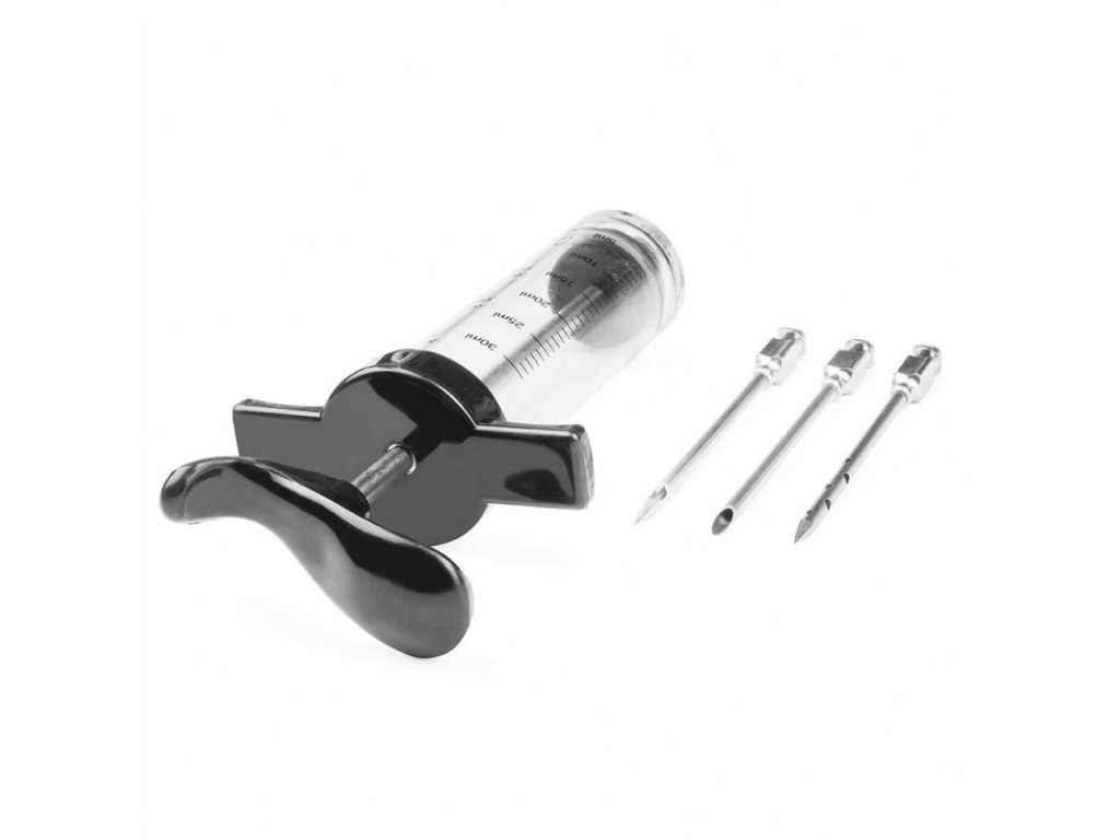 Stříkačka se dodává se třemi jehlami s různými hroty. Směs koření tedy můžete dát do masa třemi různými způsoby. Výrobek je vyroben z plastu a nerezové oceli, díky čemuž je odolný proti poškození a vlhkosti.