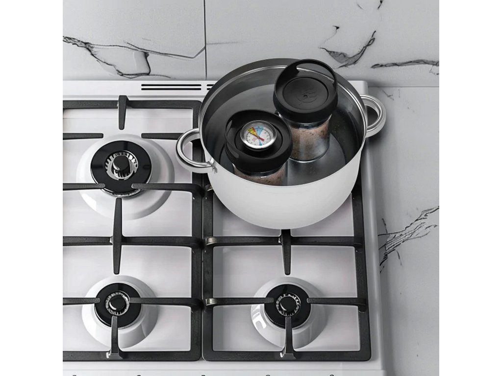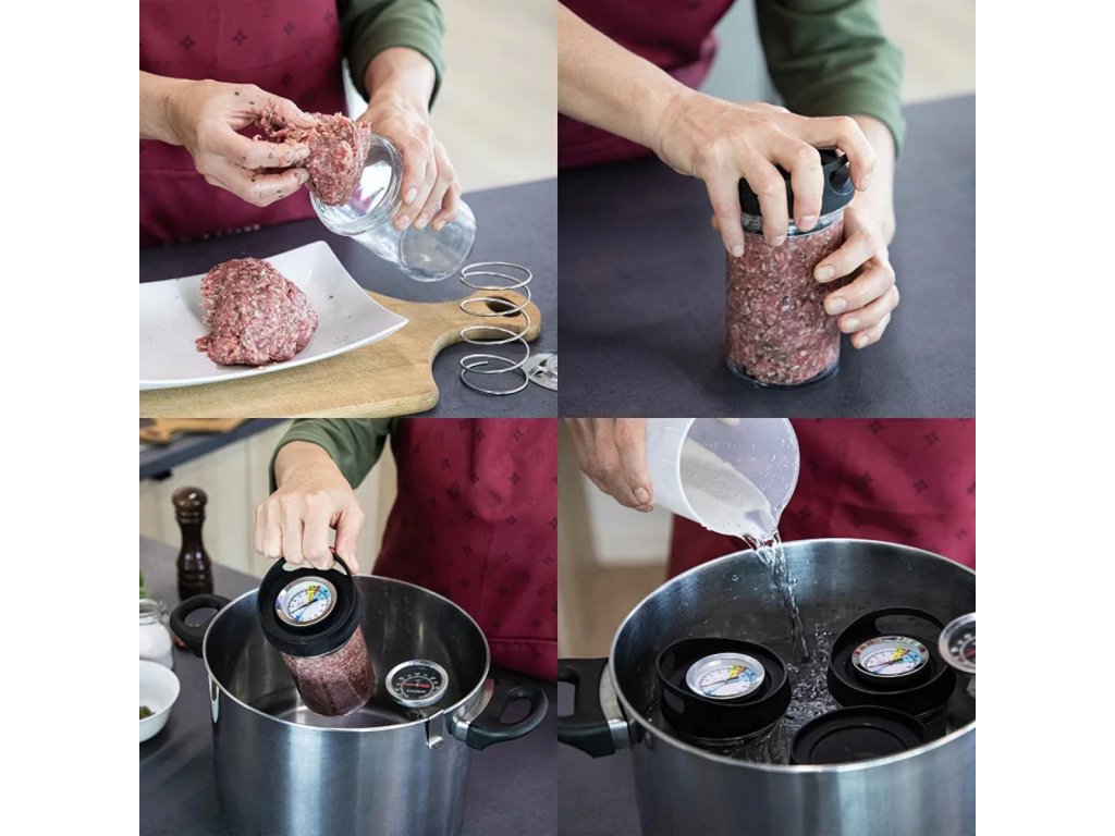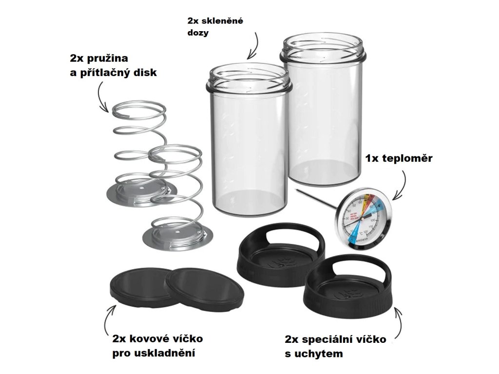 • Balení obsahuje: 2× skleněná nádoba, 2× přítlačná deska, 2× pružina, 2× víčko s držadlem a otvorem pro teploměr, kovový uzávěr