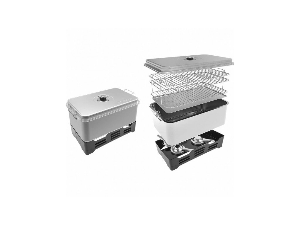 Pevný a promyšlený design činí výrobek extrémně odolným a snadno se udržuje v čistotě. Dva hořáky poháněné gelovým palivem vám umožní kouřit bez přístupu k plynu nebo elektřině. Uzení spočívá v zahřívání udicích třísek umístěných na dně udírny zespodu, v důsledku čehož vzniká kouř. Přebytečný tuk vznikající při uzení odkapává na speciální tukovou vaničku, díky čemuž se nepřepaluje a celá udírna nevytváří téměř žádný kouř. Zásobník zároveň zaručuje žádný kontakt mezi palivem a uzeným jídlem. Speciální hořáky, ve kterých je umístěno gelové palivo bez zápachu a zápachu, mají nastavení plamene, které umožňuje zvýšit nebo snížit teplotu v udírně. Teploměr zabudovaný ve víku udírny umožňuje tuto teplotu kontrolovat. Právě díky ní zjistíte, zda proces uzení probíhá v optimálních podmínkách a vaše oblíbené pokrmy budou aromatické a lahodné!