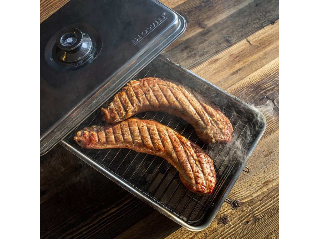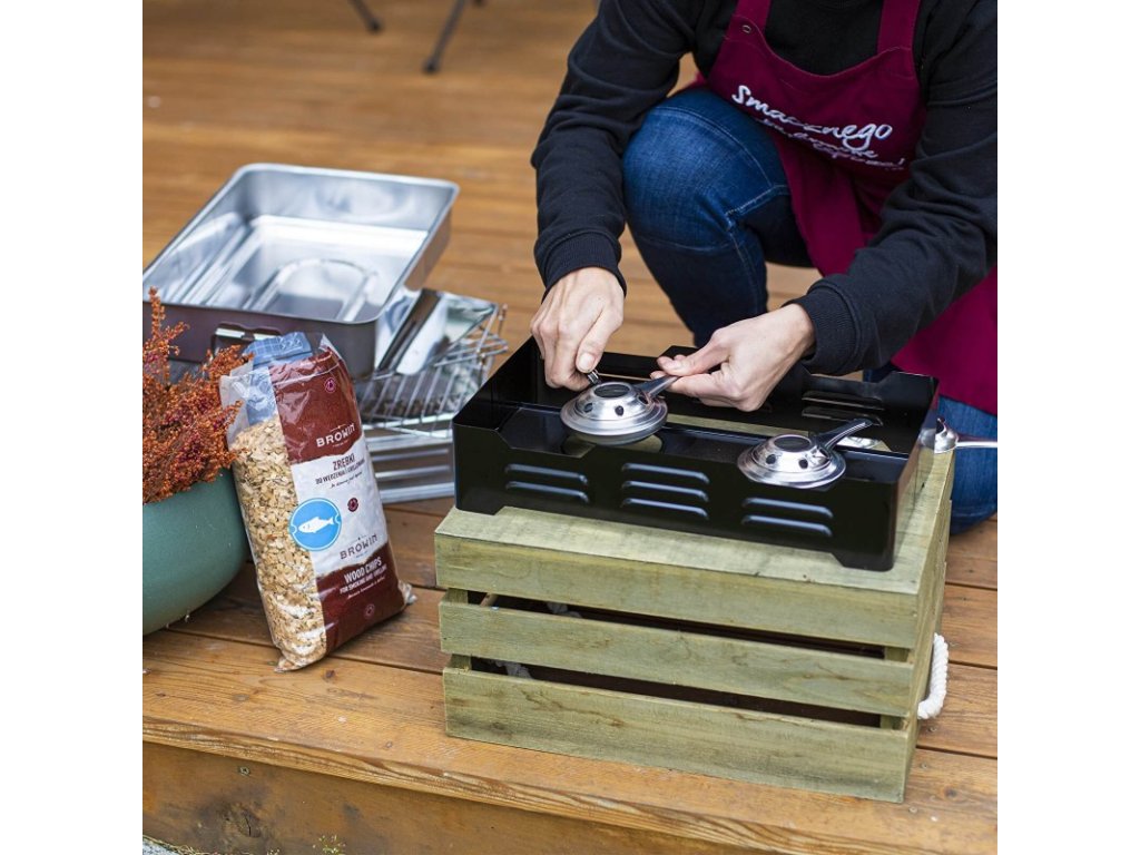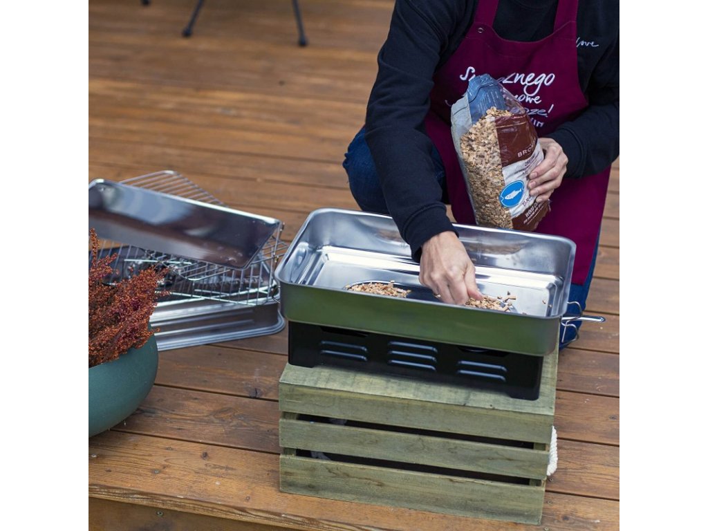 Na dně udírny je umístěna speciální tuková vanička, která zabraňuje přepalování tuku. Díky tomu udírna nevytváří téměř žádný kouř, což je ideální pro použití na balkoně nebo v blízkosti sousedů. Štěpky na uzení jsou zahřívány zespodu, což zaručuje autentickou chuť a vůni vašeho jídla.