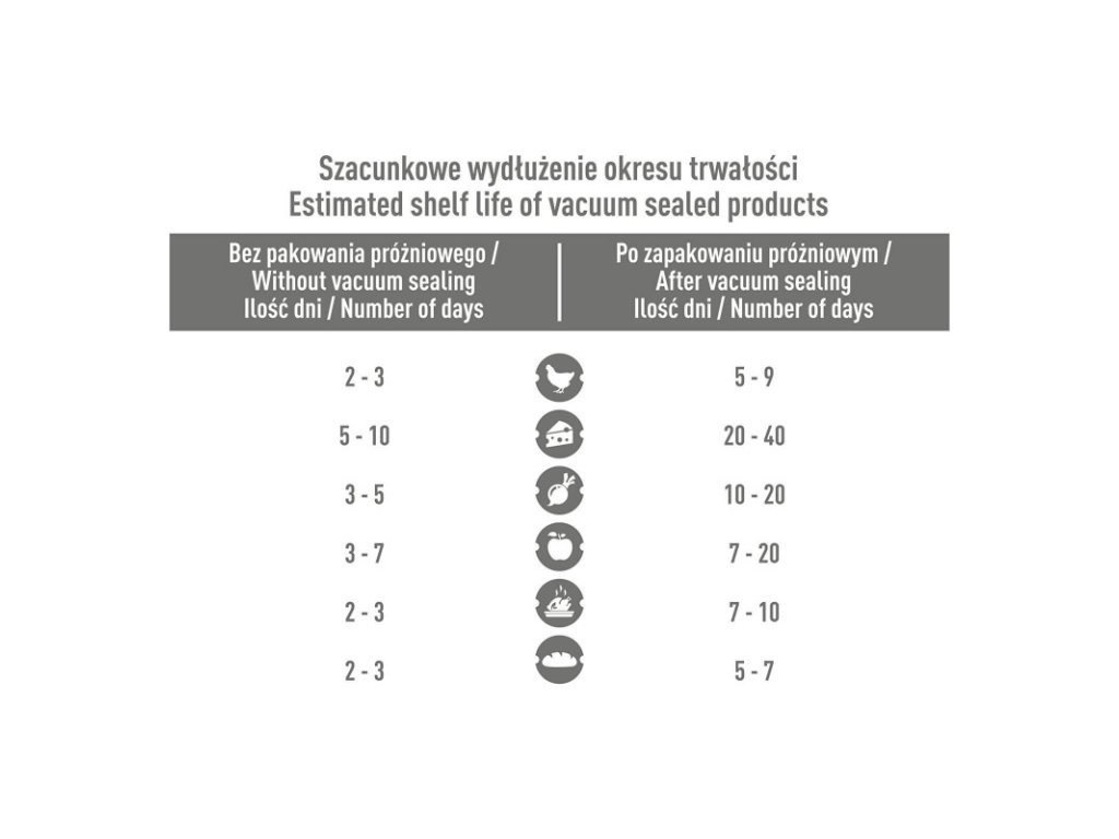 Vakuovým balením potravin chráníte výrobky proti bakteriím a plísním. Potraviny nevysychají a jsou vhodné ke konzumaci déle a produkty zůstávají déle zdravé, zachovávají si chuť a nutriční hodnotu. Vakuové těsnění vám pomůže lépe plánovat a řídit vaše nákupy, přináší pořádek do vaší kuchyně, lednice a mrazničky a dává vám neomezené možnosti. Vakuově lze zabalit téměř vše - ovoce, zeleninu, sýry, maso, uzeniny, ryby, hotová jídla, dorty atd.