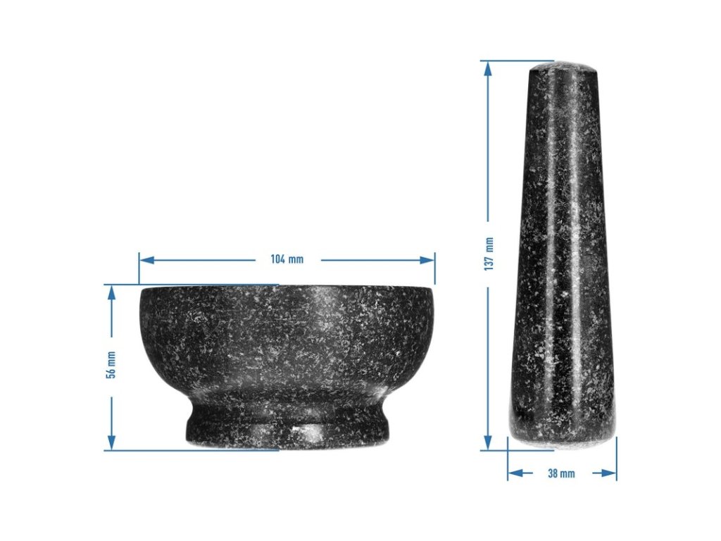 Odolný a přírodní materiál - hmoždíř o průměru 10,4 cm a palička jsou vyrobeny z odolné a ušlechtilé žuly, díky čemuž je výrobek pevný, odolný a elegantní.