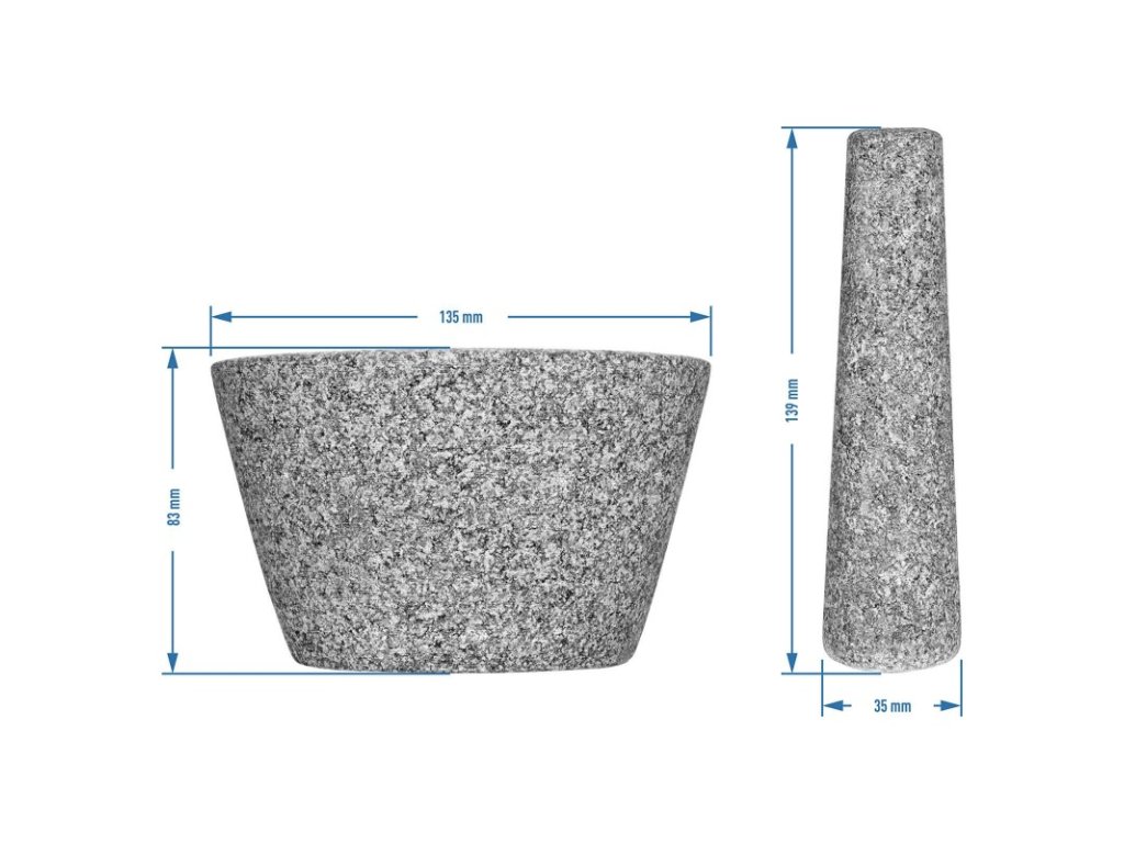 Odolný a přírodní materiál - hmoždíř o průměru 13,5 cm a palička jsou vyrobeny z odolné a ušlechtilé žuly, díky čemuž je výrobek pevný, odolný a elegantní.
