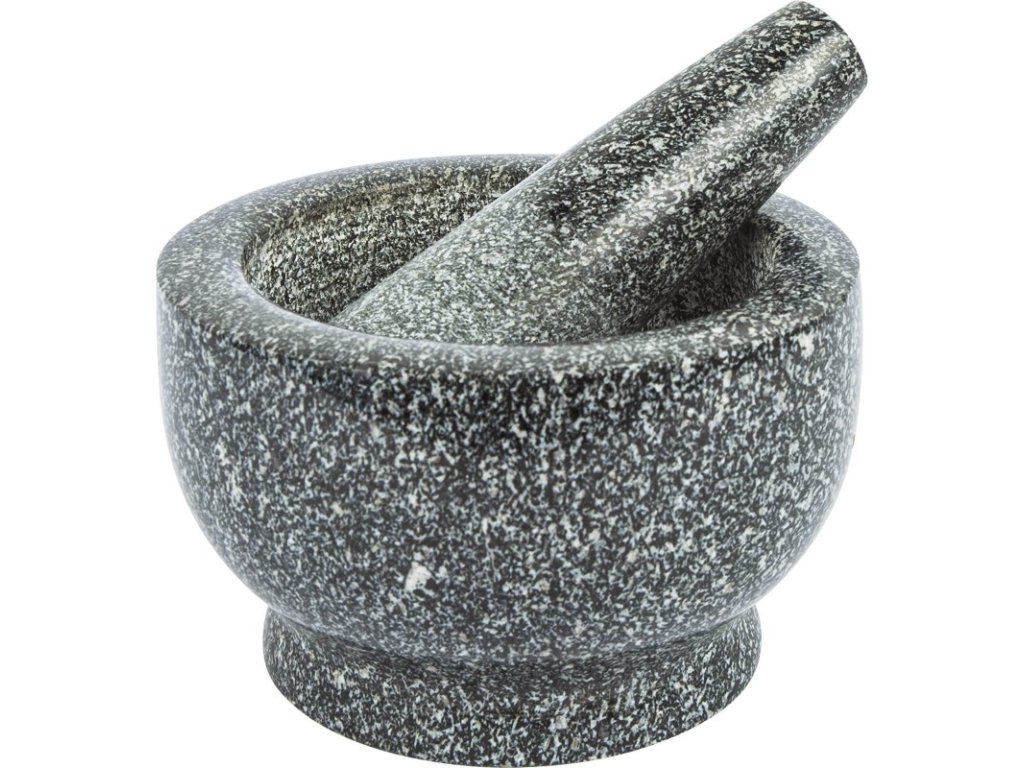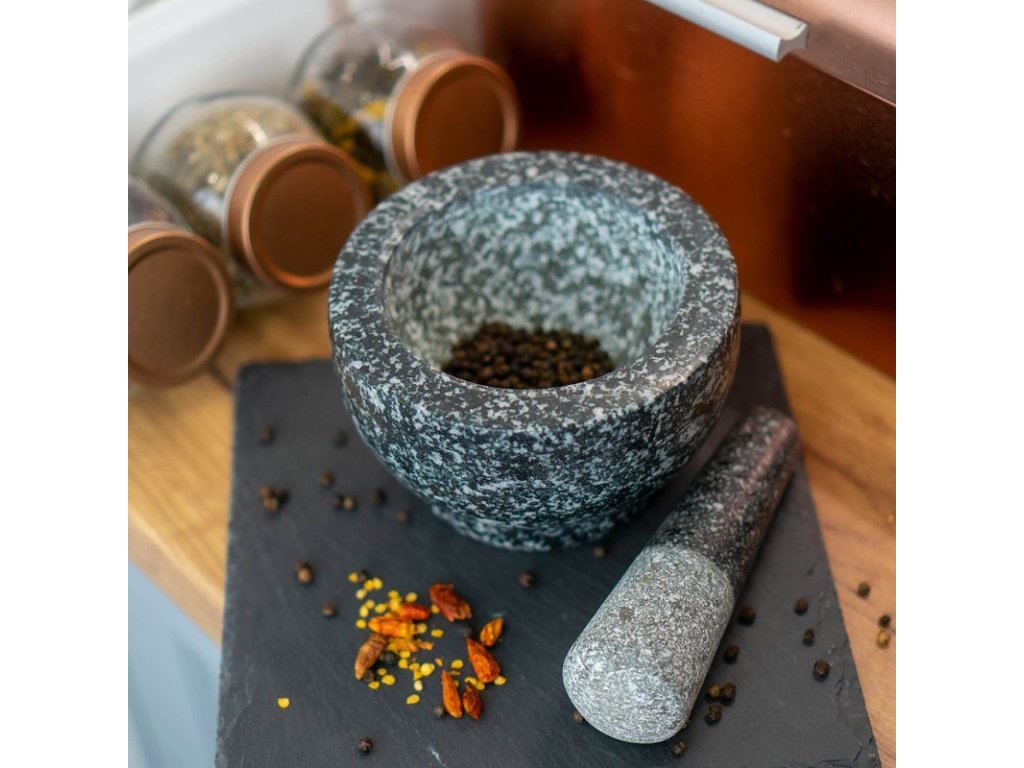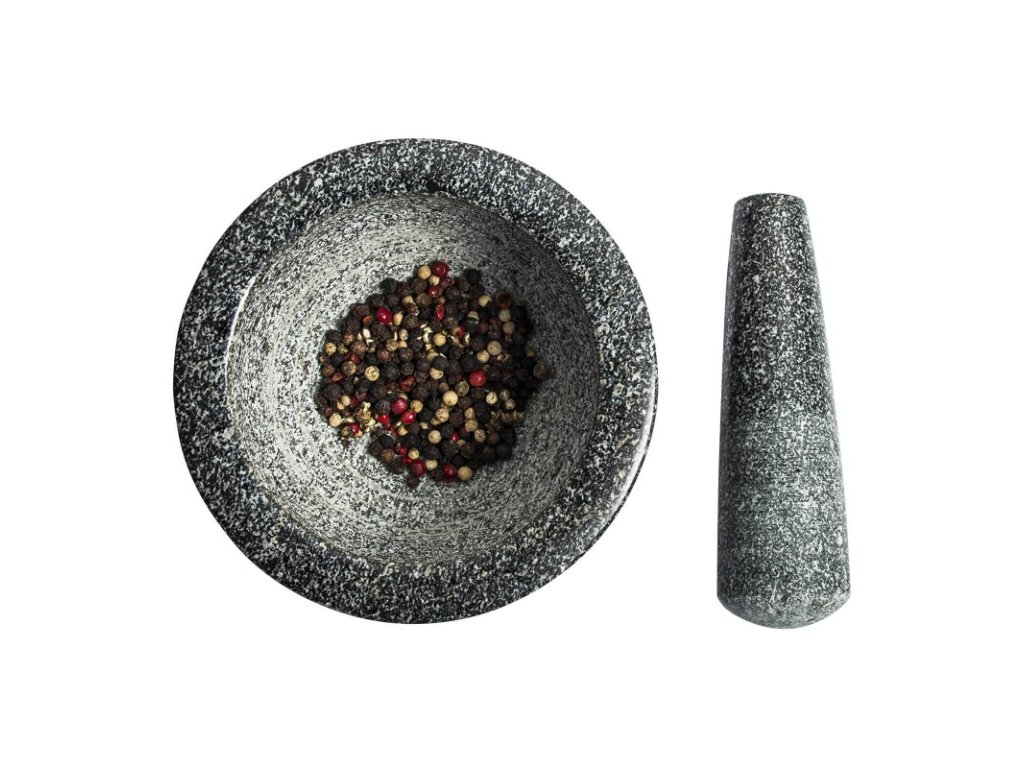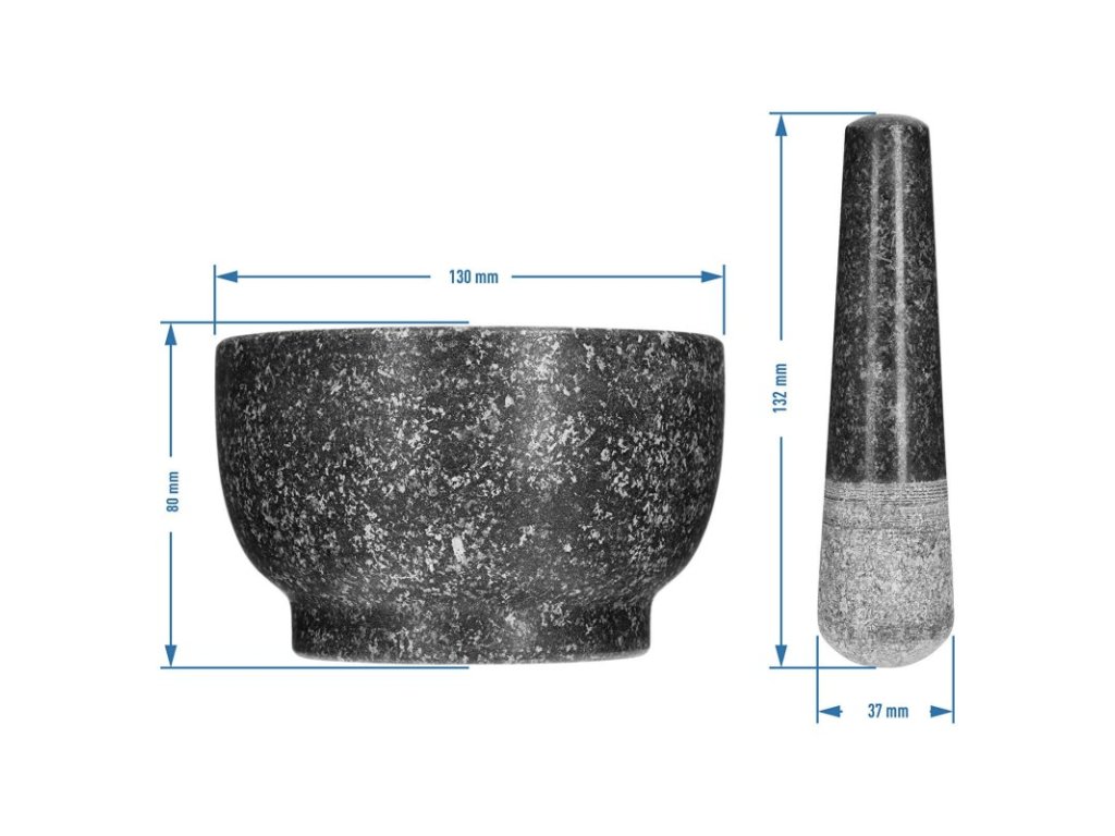 Odolný a přírodní materiál - hmoždíř o průměru 13,5 cm a palička jsou vyrobeny z odolné a ušlechtilé žuly, díky čemuž je výrobek pevný, odolný a elegantní.
